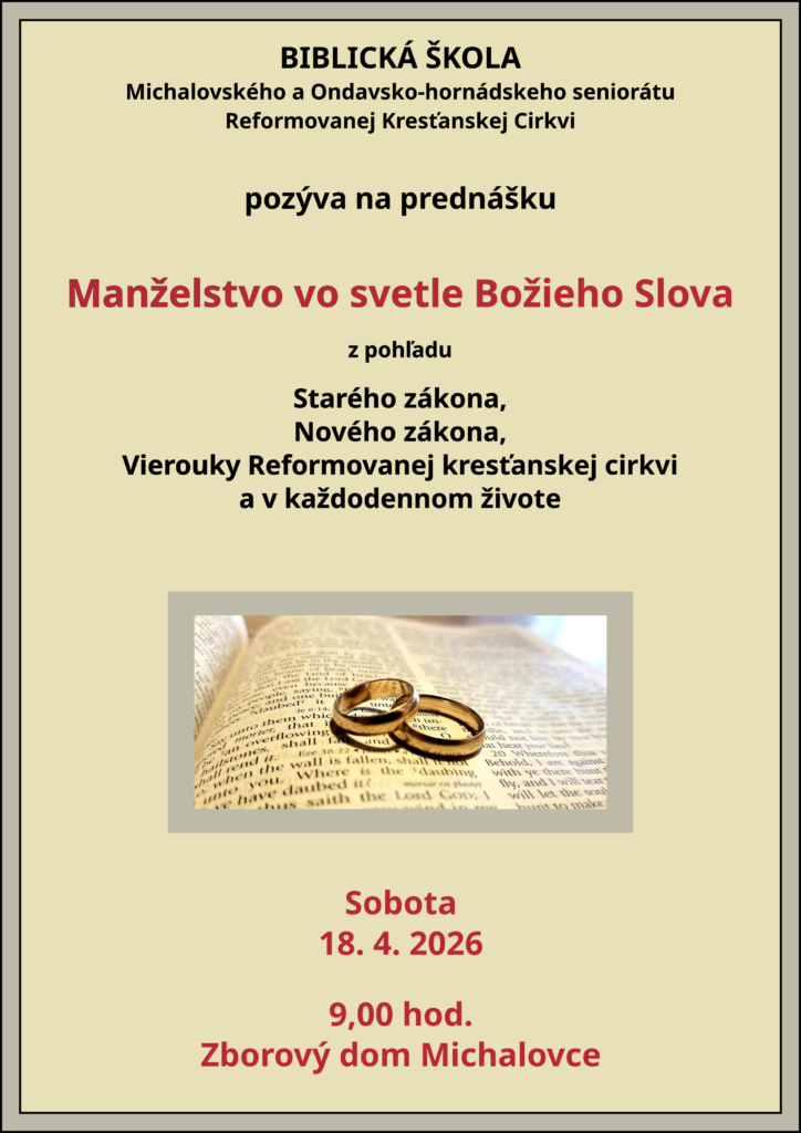 Prednáška sa uskutoční v sobotu 18.4.2026 o 9:00 hod. v Zborovom dome Reformovanej cirkvi v Michalovciach.
